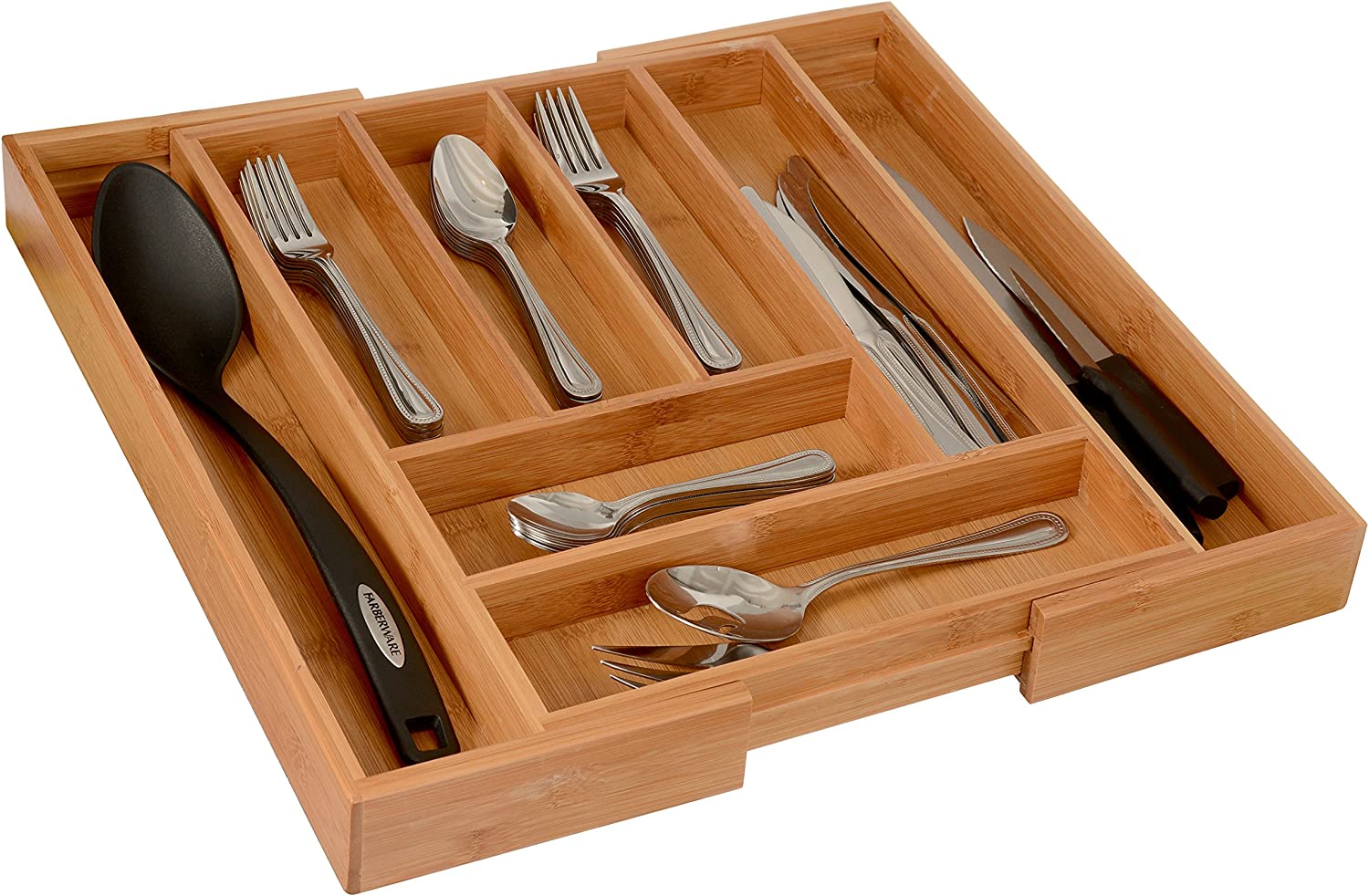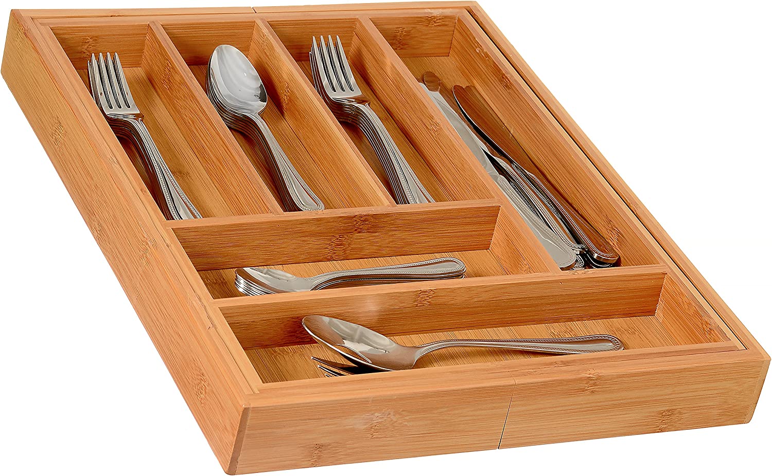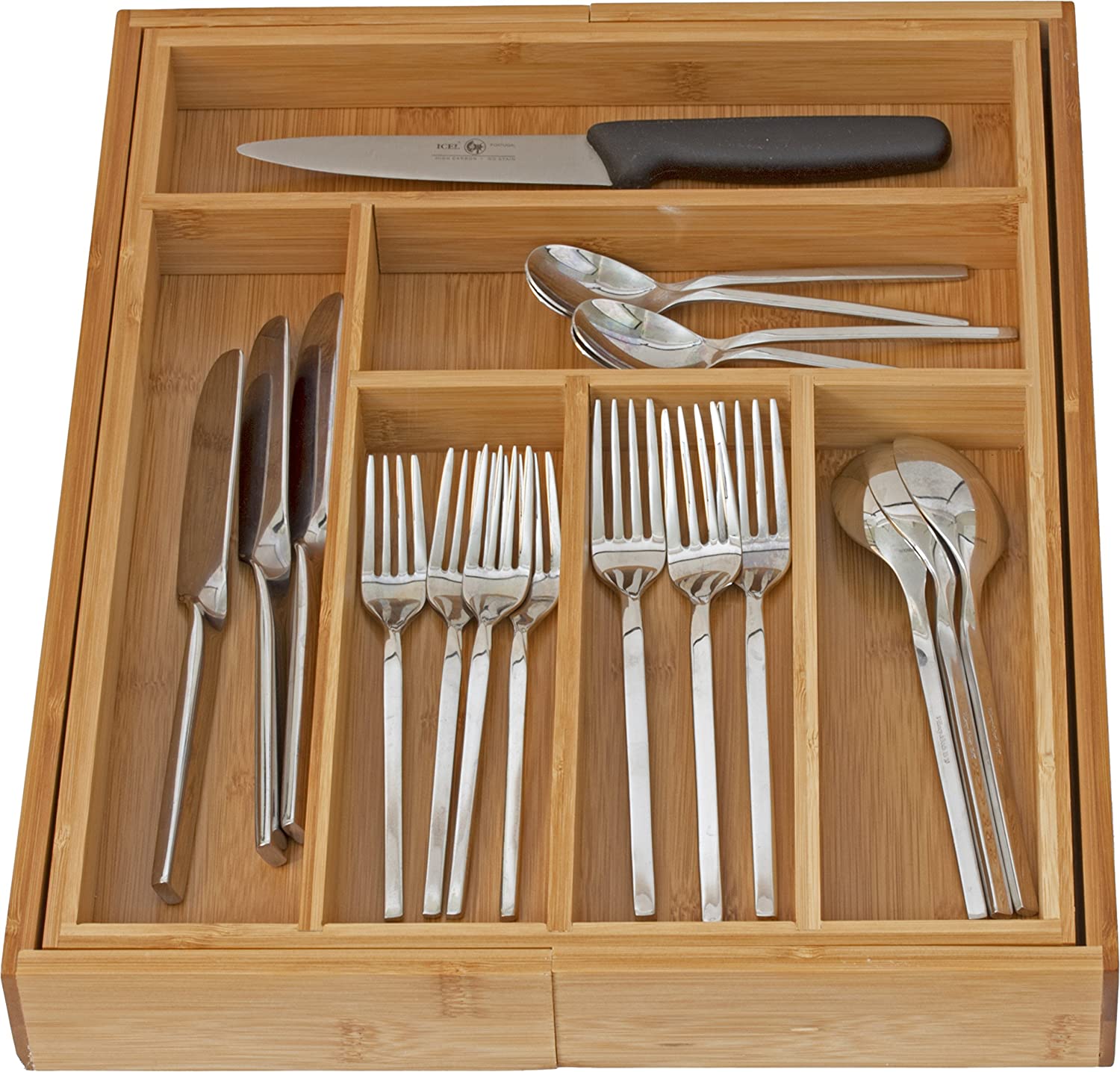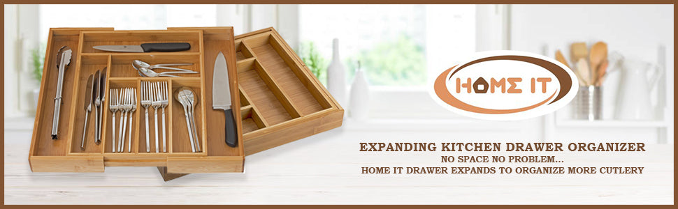 Simplify your life and beautify your utensil drawer with Home-it Expandable Utensil Drawer Organizer. It measures 18-inch long, 12 3/4-inch wide and 2-inch high and expands to 17 1/2-inch wide. Have a custom fit, beautiful utensil drawer organizer that is durable. Made of strong bamboo. Wash by hand with warm water this drawer organizer is a beautiful and functional addition to any kitchen. Bamboo is the natural alternative for all things wood. It is the fastest growing plant on our planet and does not require any special care to grow. In fact, it is a grass that produces more oxygen than a hard wood forest of comparable size, it helps to reduce carbon dioxide gases blamed for global warming, and it helps to prevent soil erosion through its widespread root system and large canopy. At home it, we are proud to say we use only the highest quality bamboo.