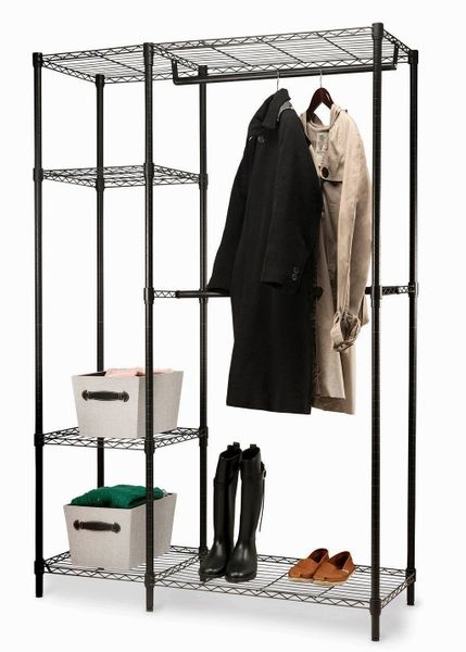 Assembles in minutes without tools. strong welded wire construction. double-sided access. rack includes 4 foot hanging rod for garments and four support hooks for umbrellas, bags and other items. three shelves support 350 lbs. open design allows air circulation and prevents dust buildup. powder coated black finish. hangers not included.